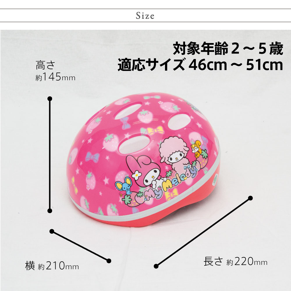 あごひもがからまないから、ひとりでかぶれちゃう! ■対応サイズ:46〜51cm ■対象年齢:2歳〜5歳くらい ■サイズ:幅210mm×奥行220mm×高さ145mm ■重量:230g ■ヘルメット本体: プラスチック ■あごひも: ナイロン ■内装パッド: PE【日本郵便のゆうパックでお届けします】 サンリオ『マイメロディー』のかわいいヘルメットです 安心のSG規格合格商品 調整ダイヤルがついているので、2-5歳まで使えます。